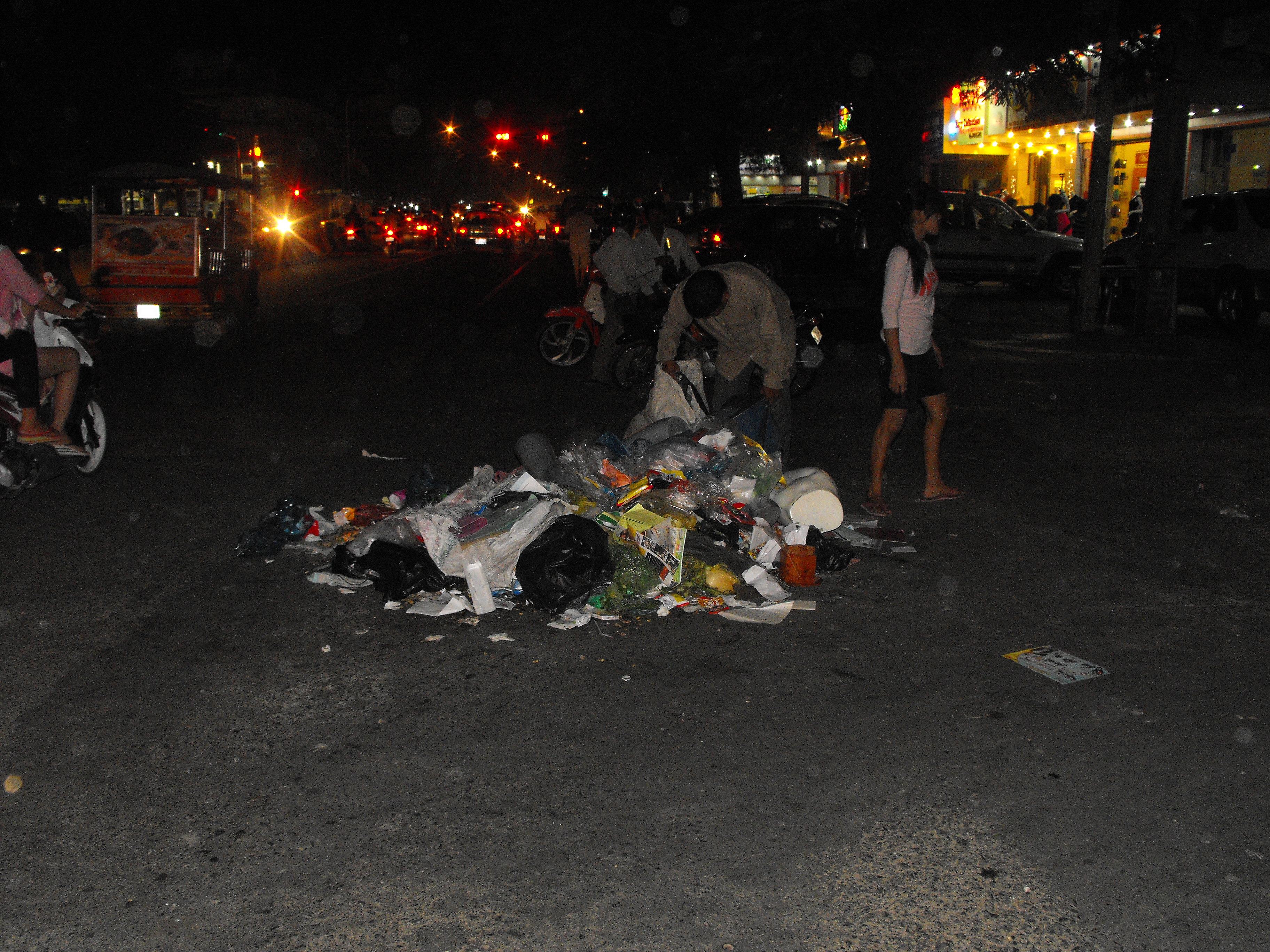 It may be hard to tell from these photos, because I have to take them at night and can’t get a really wide shot, but this trash mountain is slowly moving out into the main street as the recycle collectors appear to scavenge its rear end and the residents put more stuff on the front end. Eventually the council garbage men will have to collect it or move it. Given the way half the population think the trafic lights are meant to other people, I’ve learning to look over my shoulder in five different directions at once. Nevertheless, today the inevitble happened. A motorbike ran into my bicyce: fortunately they hit my front tyre forward of the axil, so I didn’t get knocked off. However, in viewof the number of children who play on the side of the street only 10-12 feet form bicycles and motor bikes, I have learned the Cambodian word for ‘watchout’: it’s ‘pror-yat!’: Ah well… into every life a little rain must fall. Tomorrow will be a wasted day filling in forms.