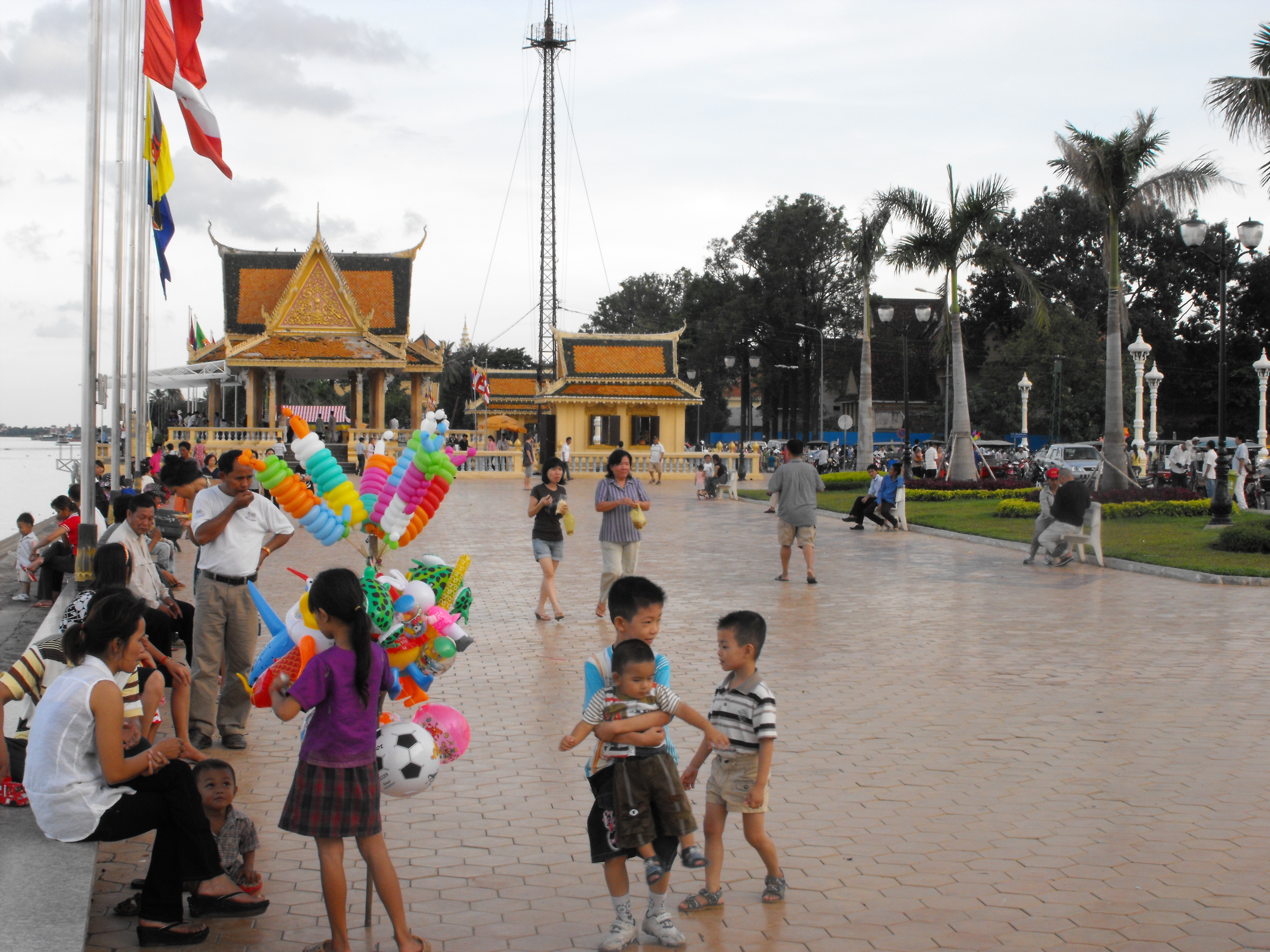 I discovered the other day street 178 goes all the way from Monivong Boulevard (a very major road near where I live) to Sisowath Quay (the water front area) in a straight line with no interruptions for temples palaces or museums. So I hopped on my bike tonight and headed down to a cafe near the waterfront. (For those watching the photos, the Royal Palace is opposite the waterfront